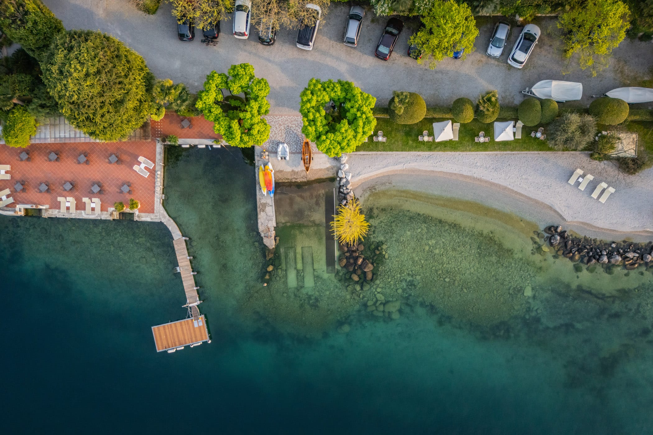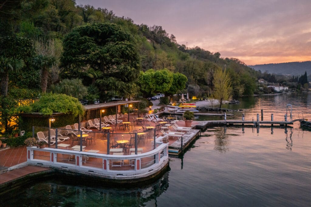 Depuis la plage, vous accédez également à notre terrasse panoramique, suspendue au-dessus de l’eau – un lieu enchanteur pour admirer pleinement les lumières changeantes et les couleurs du lac de Garde.